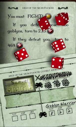 De vez en cuando se le presenta una situación que debe resolverse con un poco de tirar los dados. El motor de gamebook permite tirar los dados basados en la física en 3D que ruedan y rebotan como si estuviera a lanzar sobre una mesa. Tirar los dados para resolver el combate al enfrentar a su personaje en contra de una multitud de enemigos. Tira los dados para ver si eran capaces de saltar el abismo enorme, o recoger los bolsillos del shopkeep de. Tira los dados para ver si has ganado una apuesta, o contrajo la peste!