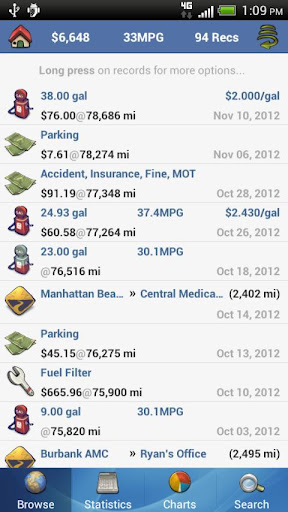 Utilice la aplicación aCar para gestionar y realizar un seguimiento de sus vehículos: Fillups, consumo de combustible, mantenimiento, gastos y Trips