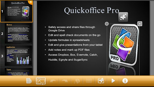** Temporada de Dar Ahorros ** Trabajo más inteligente desde cualquier lugar con Quickoffice Pro en su teléfono inteligente Android. Esta solución todo-en-uno permite conseguir trabajo real en línea y fuera de línea, como la edición de documentos de Microsoft ® Office, hojas de cálculo y presentaciones, así como la anotación de los archivos PDF. También será capaz de acceder a Google Drive u otras cuentas de almacenamiento en la nube, gestionar sus archivos adjuntos de correo electrónico, y acceder a los archivos guardados localmente.