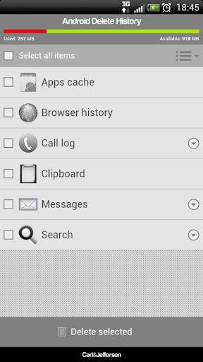 Puede borrar los mensajes, borrar envió de SMS y MMS, claro recibió SMS y MMS de la historia. NO raíz necesario. Limpie todos los archivos de caché de aplicaciones, borrar el portapapeles, limpiar con frecuencia llamado, y el historial del navegador de limpieza. Eliminar el historial de búsqueda del navegador, historial de búsquedas Google Maps. Liberar memoria y espacio libre en disco para conseguir más espacio libre. Eliminar el historial de Android es similar a CCleaner en el PC o History Eraser. Eliminar el historial de Android es la herramienta de borrado de la historia con un diseño personalizado único y fácil de usar interfaz de usuario. Disfrute de este borrador de la historia.